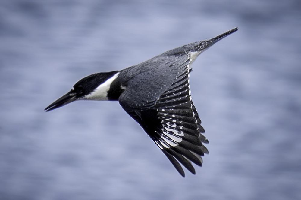 The Belted Kingfisher is a large conspicuous bird, with a hefty pointed bill, shaggy crest, and top heavy physique. Males are a powdery blue-gray with a blue band across the white breast, while females have a blue and chestnut band.
