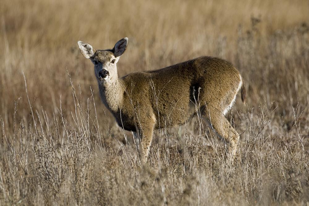 Black-tailed mule deer typically travel in small social groups, but they often graze as large groups in open meadows. Females stay close to their birth territory, while males leave and have a larger range.