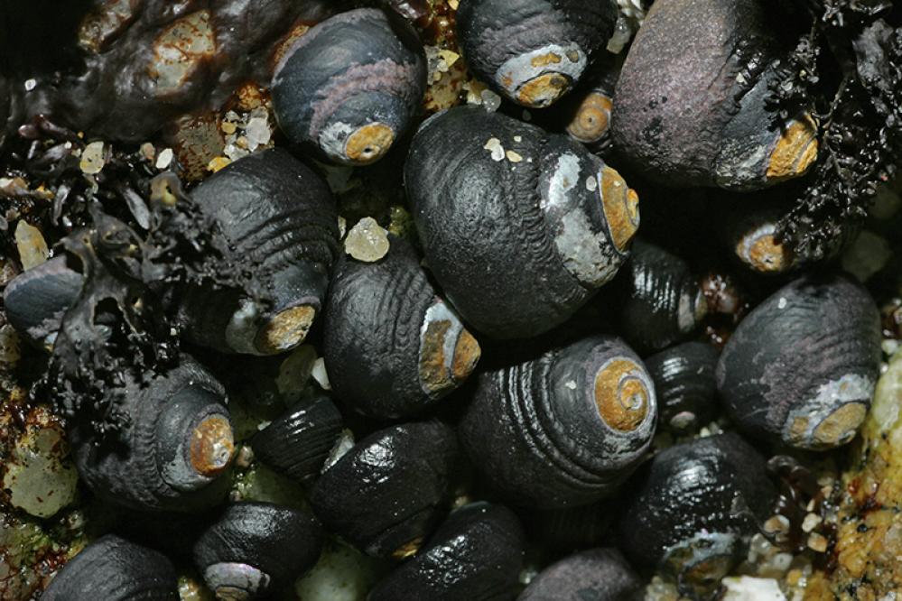 High intertidal snail with a purple-black shell measuring just over 2.5 cm (1 in) in diameter. It can be found along the Pacific coast from Canada to Baja Mexico.