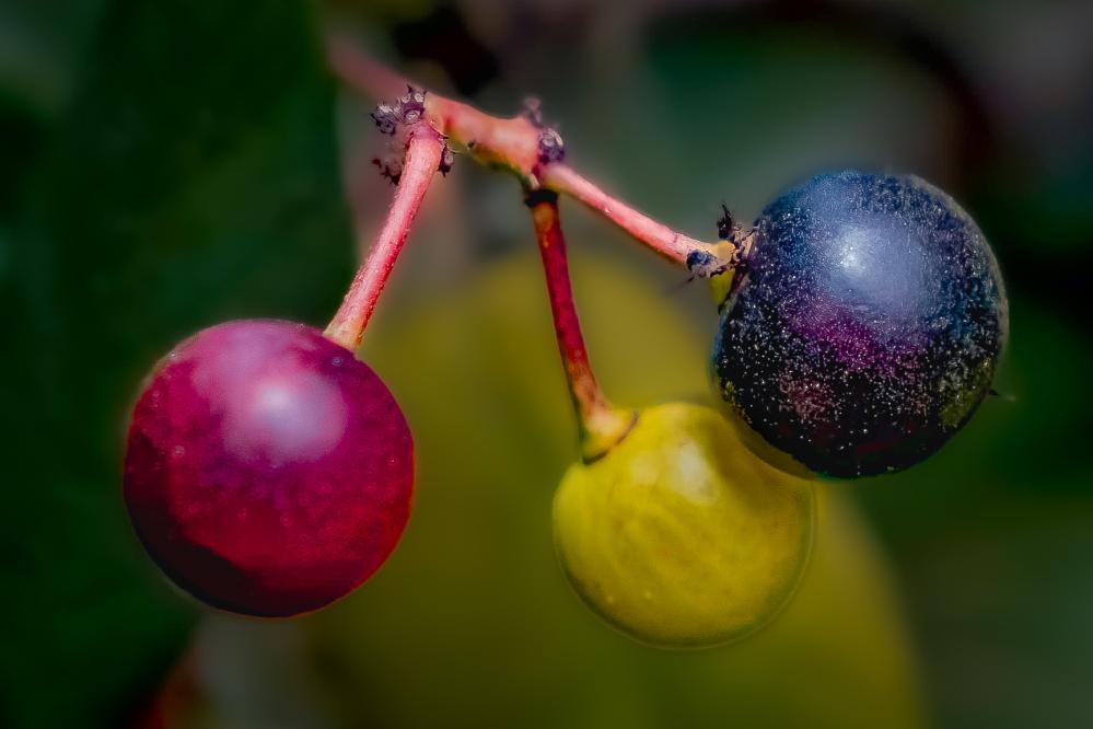 The shrub's fruit ("berries") ripen from green to yellow, then red, then purple, and ultimately to black, typically between July and November.