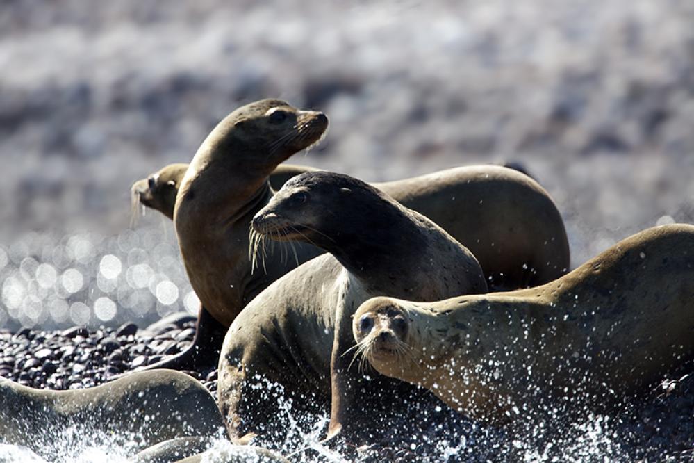 Sea lions are very social animals. Large groups rest closely packed together on land, even sprawled over one another. They often float together on the water’s surface in rafts with one or both flippers raised out of the water. When first noticed, the flipper might be confused with the dorsal (back) fin of a whale or shark. The flipper is raised to help warm or cool the body – called thermoregulation. When not congregating together to rest, they can be seen swimming past the shoreline, sometimes jumping out of the water as they move along. This behavior is called “porpoising.” They are fast swimmers (reaching up to 25 mph), using the front flippers for propulsion and the hind flippers to steer.