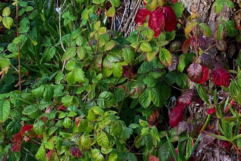 This potentially toxic shrub is found all over western North America. The leaves are grouped in threes and typically have scalloped edges and appear shiny. Poison oak varies in color throughout the year—it can be brown, bright green, yellow-green or red.