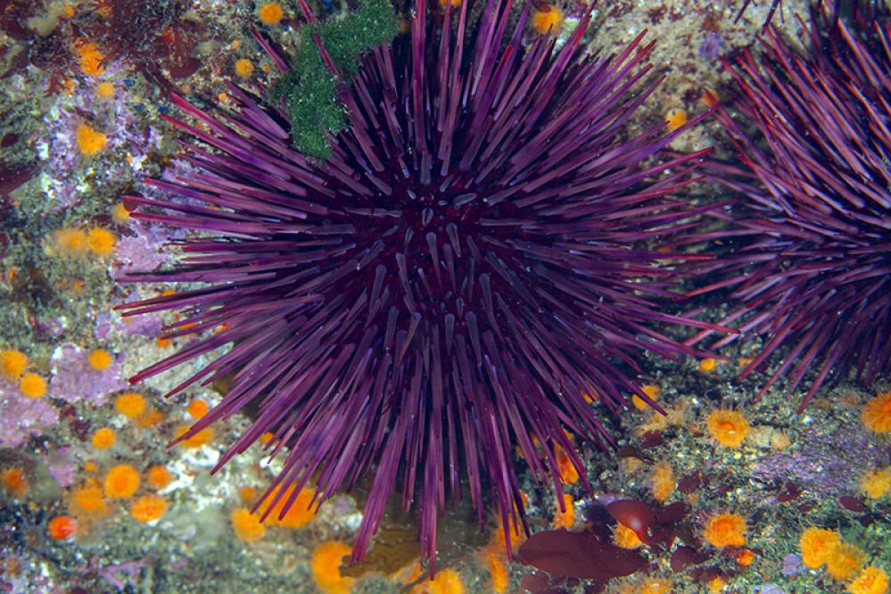 A purple-hued, spiny, round invertebrate up to 7 cm (3 in) across.