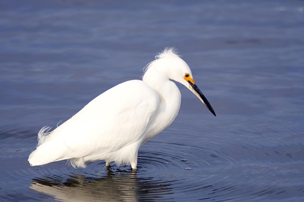 One of the smaller (51–69 cm/20–27 in length) egrets and herons, with all-white plumage, black legs and striking yellow feet. Its range extends across the entire continental United States.