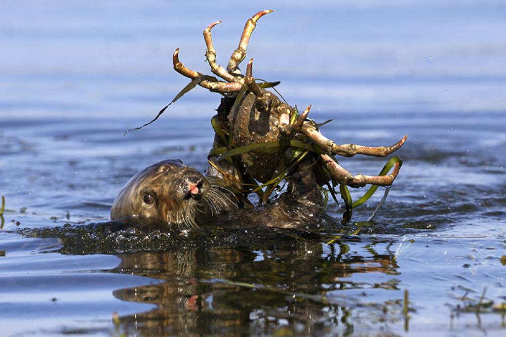 Dives to the sea floor for food (crabs and shellfish) and eats while floating on its back in the kelp canopy. Uses its strong teeth or tools (usually rocks) to crack open the shells of its prey. Winds itself in kelp to keep from floating away while sleeping.