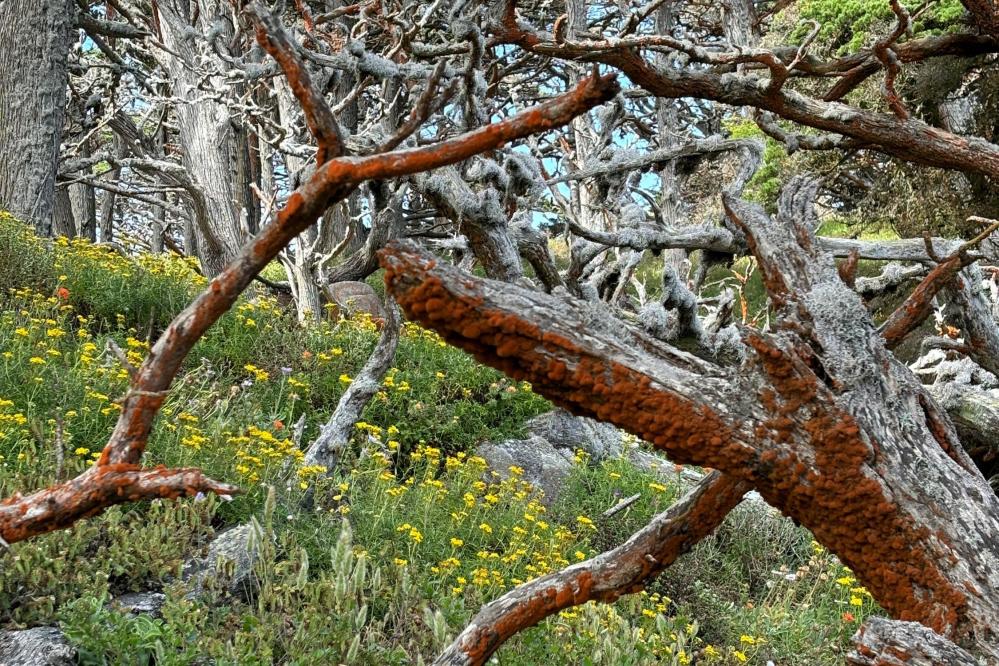 This rust red alga grows in the Cypress Grove of Point Lobos. It lives on tree branches and rocks in this chilly, northern-facing environment. Because the alga often grows on dead branches, some assume that the alga hurts the trees it grows on. But Trentepohlia does not harm the trees on which it is found.