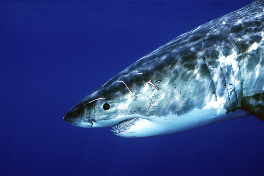 Large (over 6 m/20 ft long) shark with a dark gray backside and white underside. It has many rows of teeth with “spare rows” in the back designed to quickly replace front teeth when they are broken or fall out.